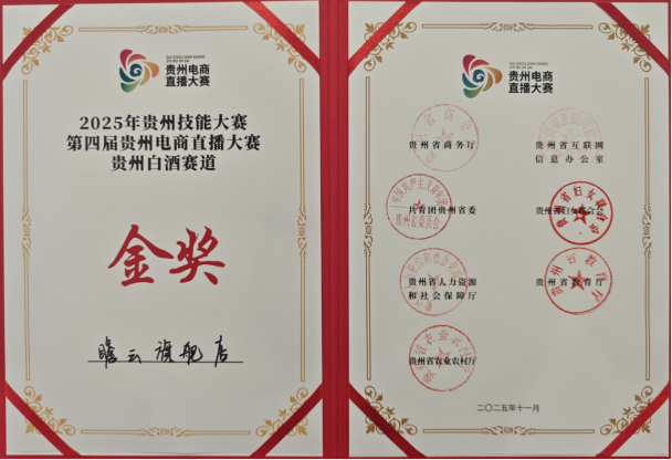2025 年 11 月 6 日,2025 貴州技能大賽——第四屆貴州電商直播大賽全省總決賽在貴州電子商務(wù)職業(yè)技術(shù)學(xué)院圓滿落幕。經(jīng)過三個月的激烈角逐,貴州瞻云酒業(yè)“瞻云旗艦店”團(tuán)隊(duì)在首次增設(shè)的貴州白酒賽道中表現(xiàn)亮眼,從全省630 支參賽隊(duì)伍、超 2200名參賽者中脫穎而出,最終摘得該賽道金獎。